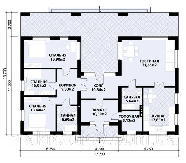 Якщо розглядати будинок у блоках, в одному — є нічна зона: 3 спальні, ванна та коридор, проходячи через хол, ви потрапляєте в денну зону, де розташована вітальня, топкова та кухня. З топкової кімнати та холу ви пройдете в тамбур, а з нього на терасу та вийдіть у внутрішній двір.