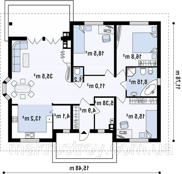 - MS-001AL. Готовий проєкт одноповерхового будинку із сучасним дизайном, передбачена ефектна тераса.