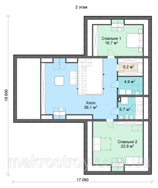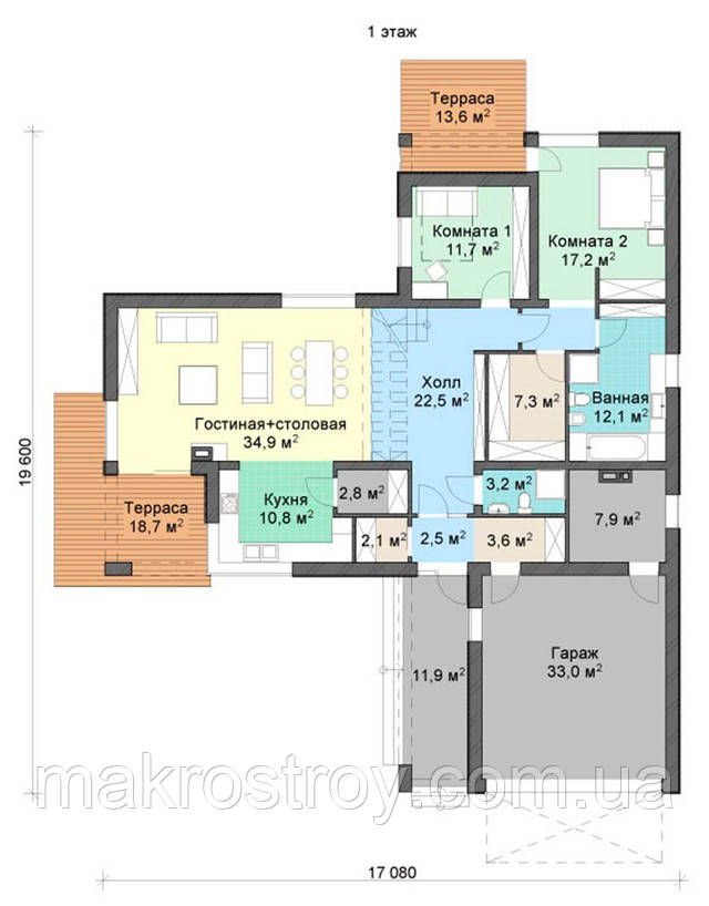 МS128 — це гарний проєкт одноповерхового будинку, у якому чорний простір житловий. Такий проєкт тільки має зовнішній вигляд одноповерхового котеджу, а виконує функції комфортного двоповерхового будинку.